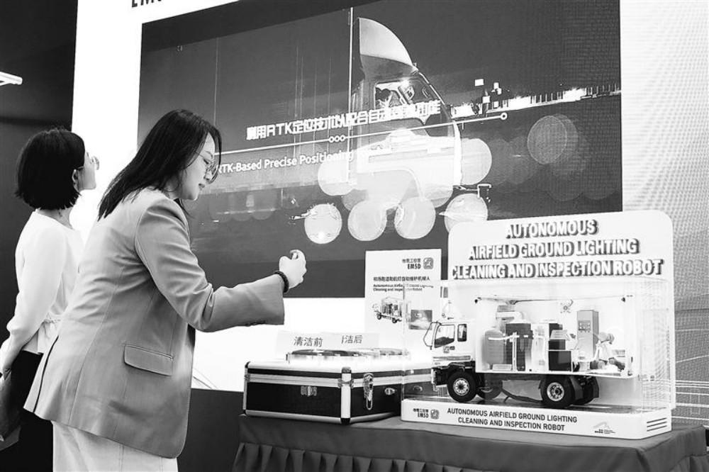 4月20日,“香港工程传奇展览@首都”启动仪式在国家科技传播中心举办。图为观众观看机场跑道助航灯自动维护机械人模型。本报记者 洪星摄