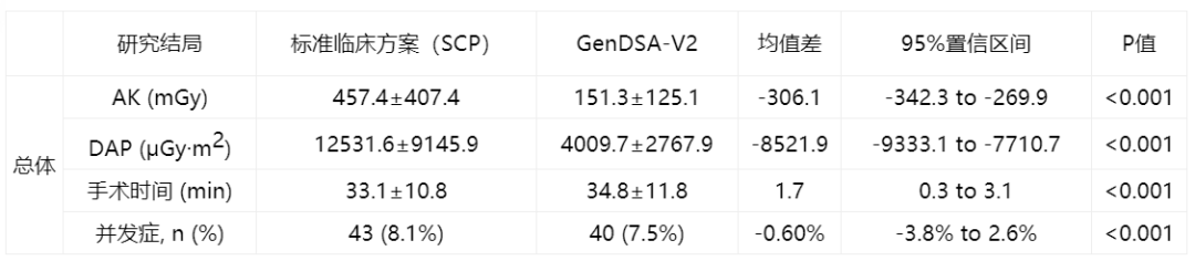 与标准临床协议组相比,GenDSA-V2组患者接受的辐射剂量显著降低:空气比释动能(AK)从457.4 mGy降至151.3 mGy,剂量面积乘积(DAP)从12,531.6 μGy·m²降至4,009.7 μGy·m²,降幅均约达三分之二(表1)。研究同时证实,两组在手术时间、并发症发生率及影像诊断质量方面无显著差异,表明该系统在显著降低辐射剂量的同时,未影响手术安全性与诊疗效果。