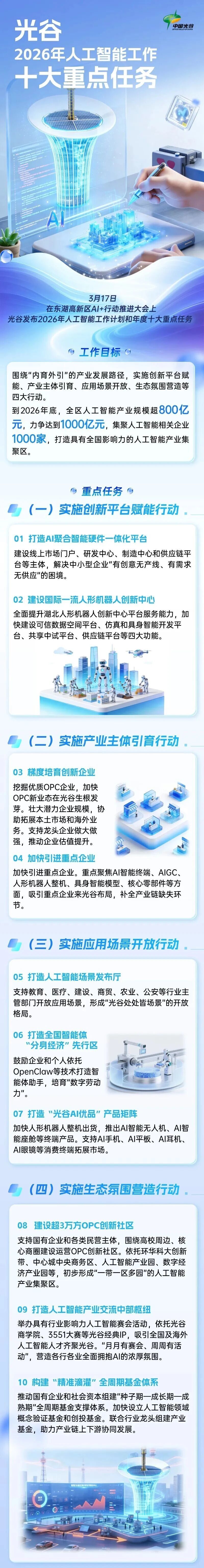 3月17日,在东湖高新区AI+行动推进大会上,光谷发布2026年人工智能工作计划和年度十大重点任务。