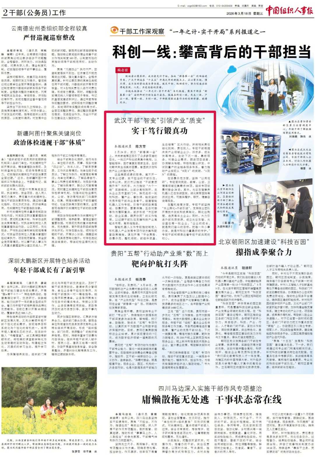3月18日,《中国组织人事报》以《武汉干部“智变”引领产业“质变”——实干笃行锻真功》为题,报道武汉以推进“干部素质提升年”为抓手,推动干部在科技创新等“六个一线”实践锻炼的相关经验做法。