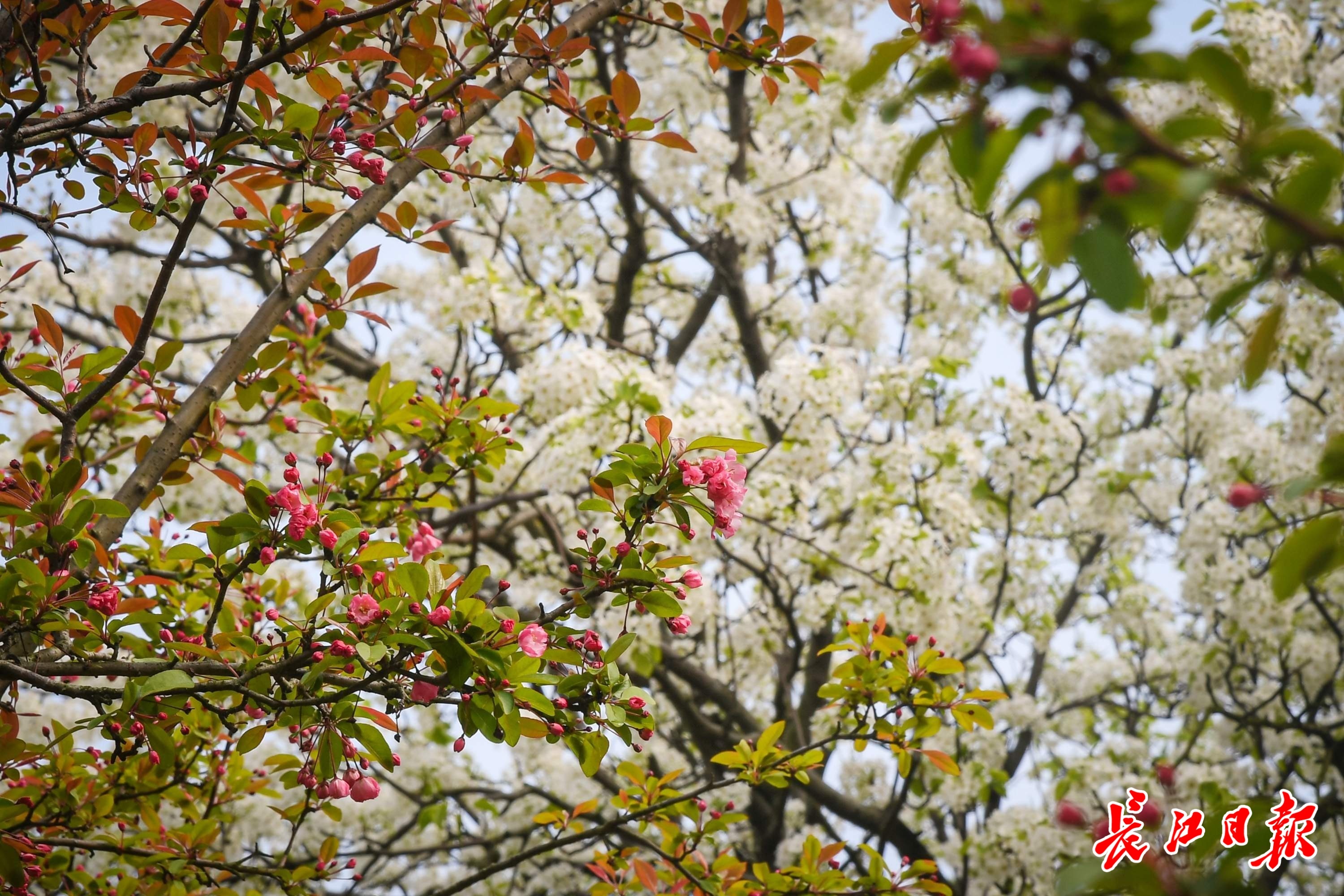 其间,有几株迫不及待的海棠已绽放笑颜,粉红的花朵与杜梨白花遥相呼应,一高一低,一白一粉,构成了一幅清新雅致的春日画卷。