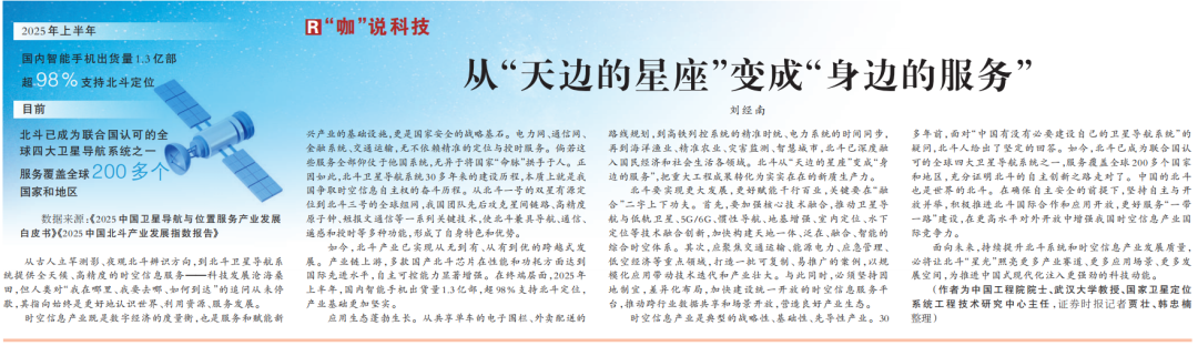 如今,北斗产业已实现从无到有、从有到优的跨越式发展。产业链上游,多款国产北斗芯片在性能和功耗方面达到国际先进水平,自主可控能力显著增强。在终端层面,2025年上半年,国内智能手机出货量1.3亿部,超98%支持北斗定位,产业基础更加坚实。